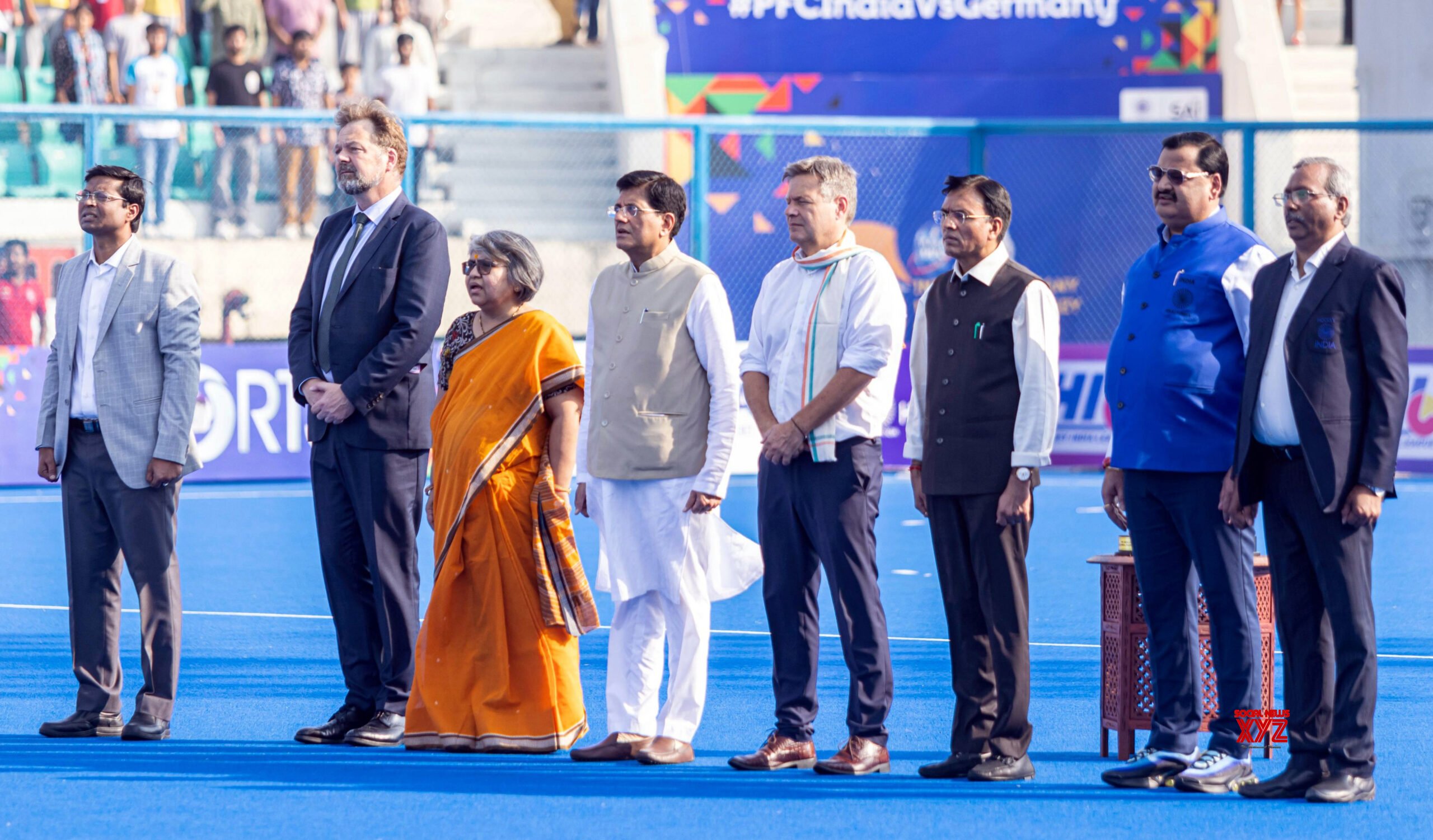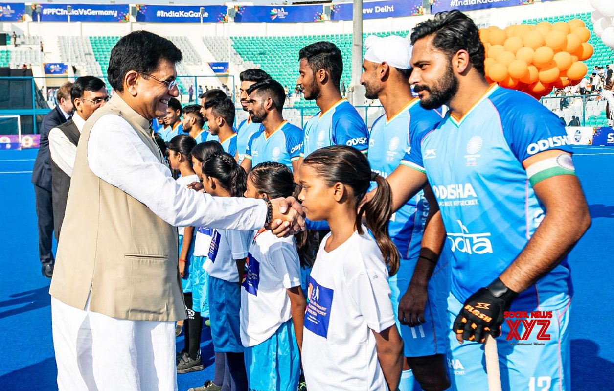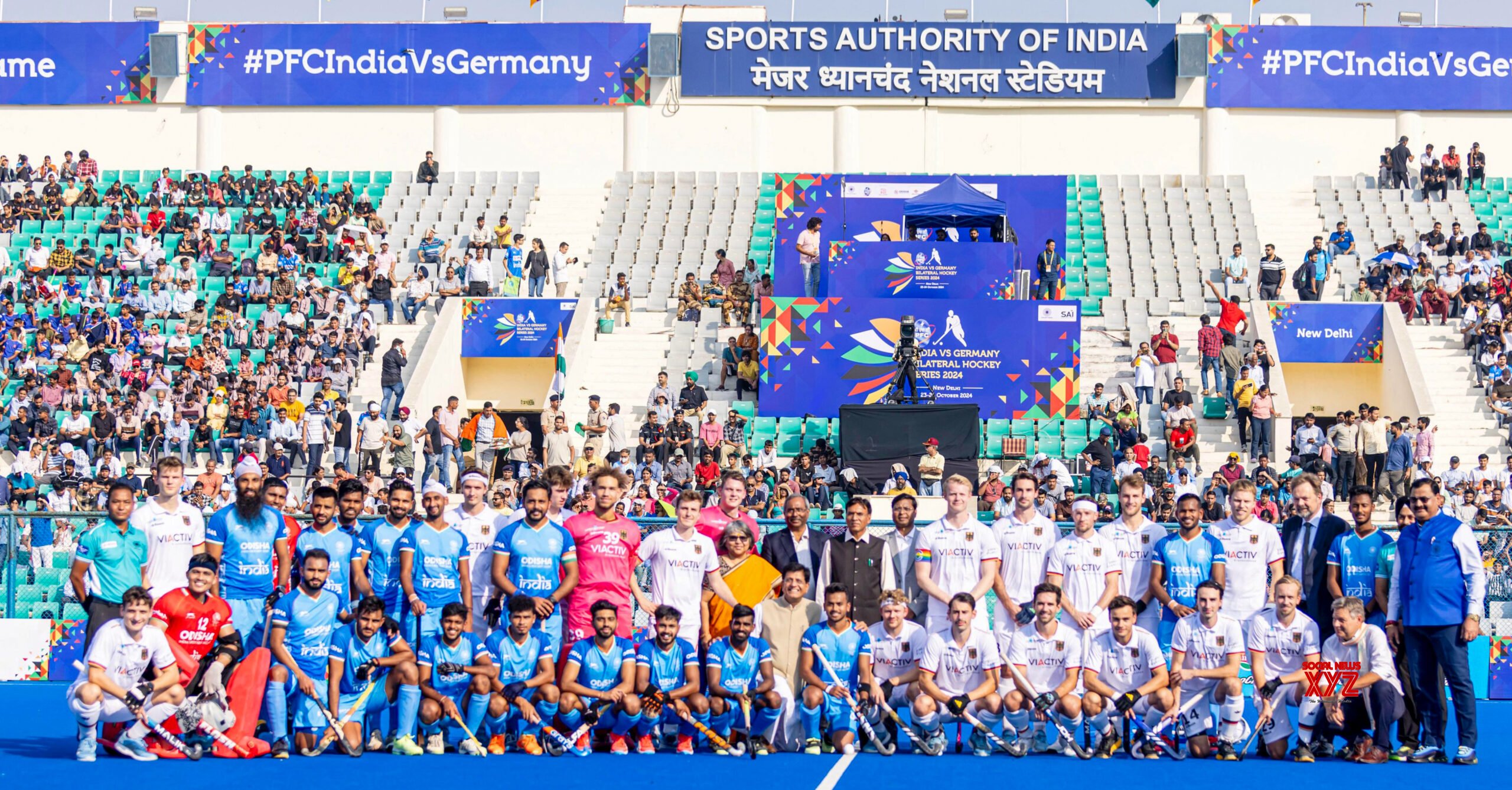 New Delhi: Union Minister Mansukh Mandaviya, along with players of India and Germany, poses for photos before the start of the first hockey match between India and Germany at Major Dhyan Chand Stadium in New…