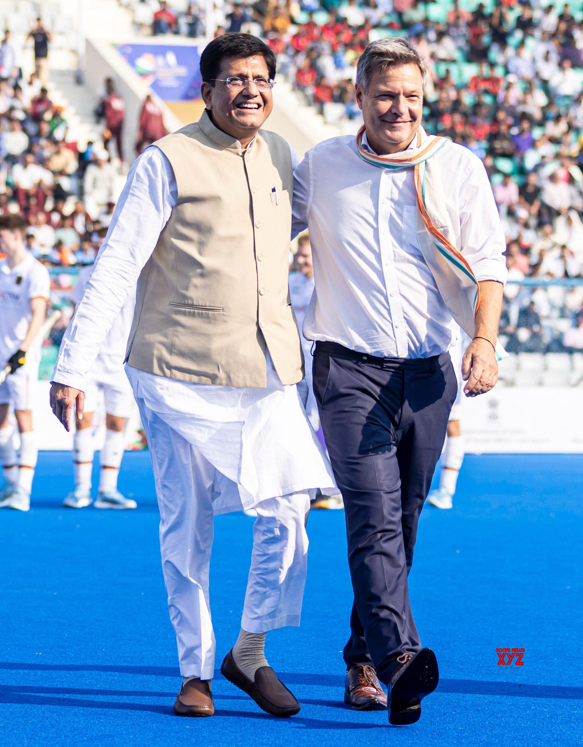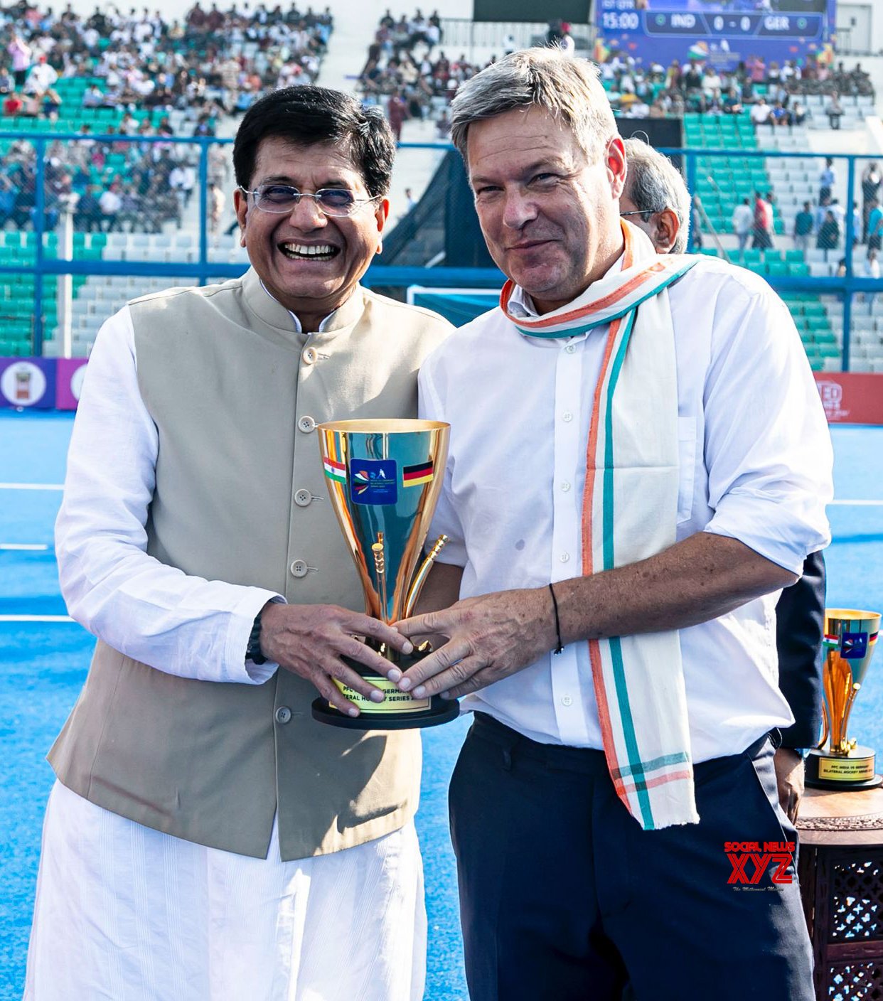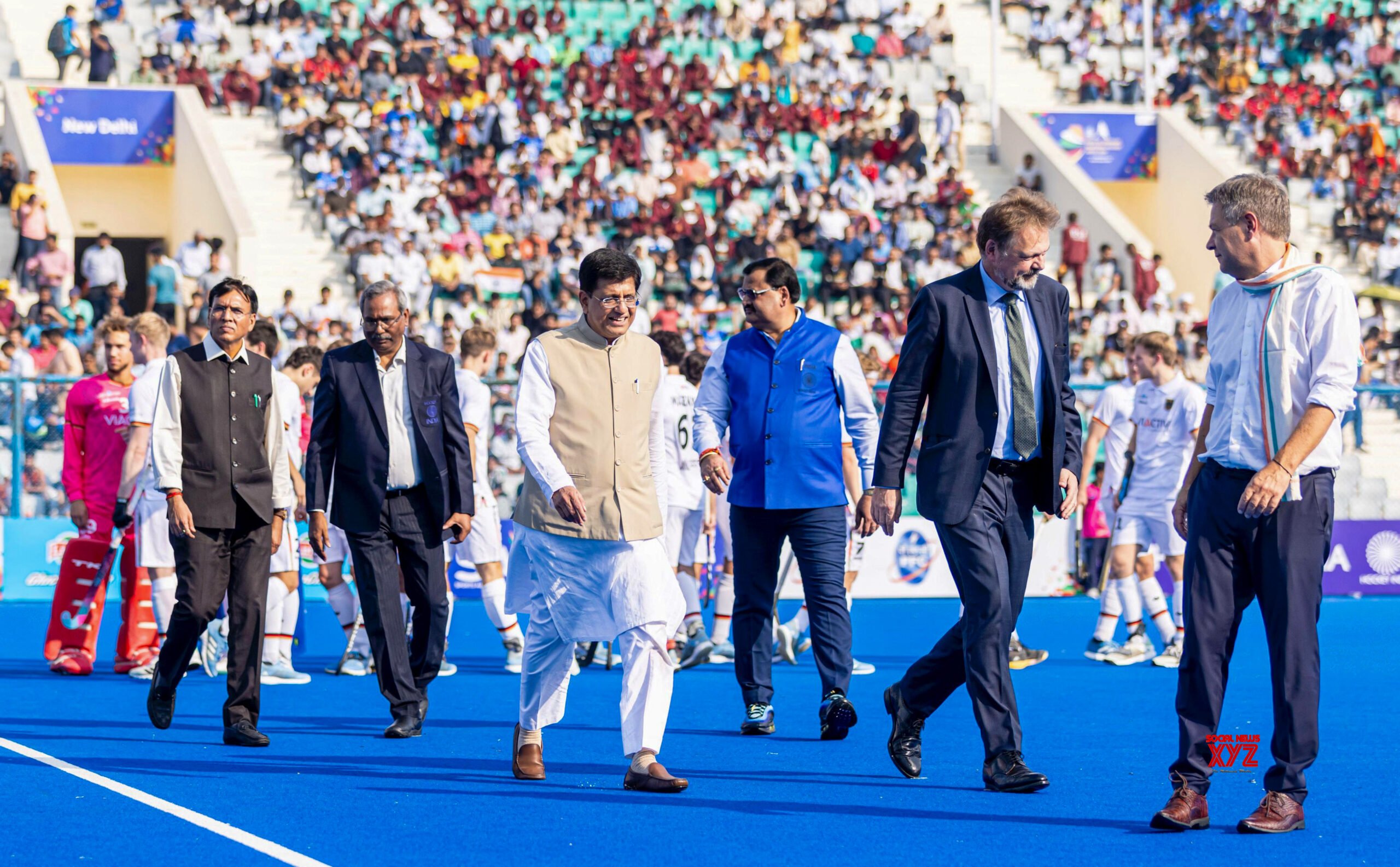 New Delhi: Union Minister Mansukh Mandaviya, along with players of India and Germany, poses for photos before the start of the first hockey match between India and Germany at Major Dhyan Chand Stadium in New…